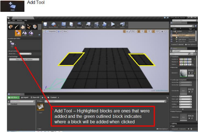 Add – Adds a section of landscape to the current Landscape and can add a number of blocks based on the value of the brush size